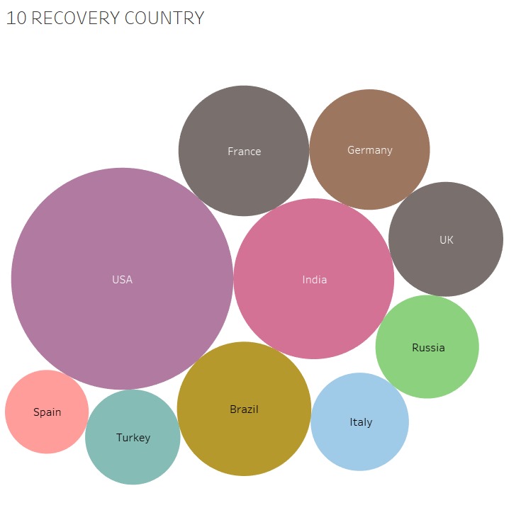 The bubble chart visualizes the top 10 countries with the highest COVID-19 recoveries, where bubble size represents the relative number of recoveries. The USA and India have the largest recoveries, followed by Brazil, France, and Germany. Other countries like the UK, Russia, Italy, Spain, and Turkey also feature but with smaller recovery counts.