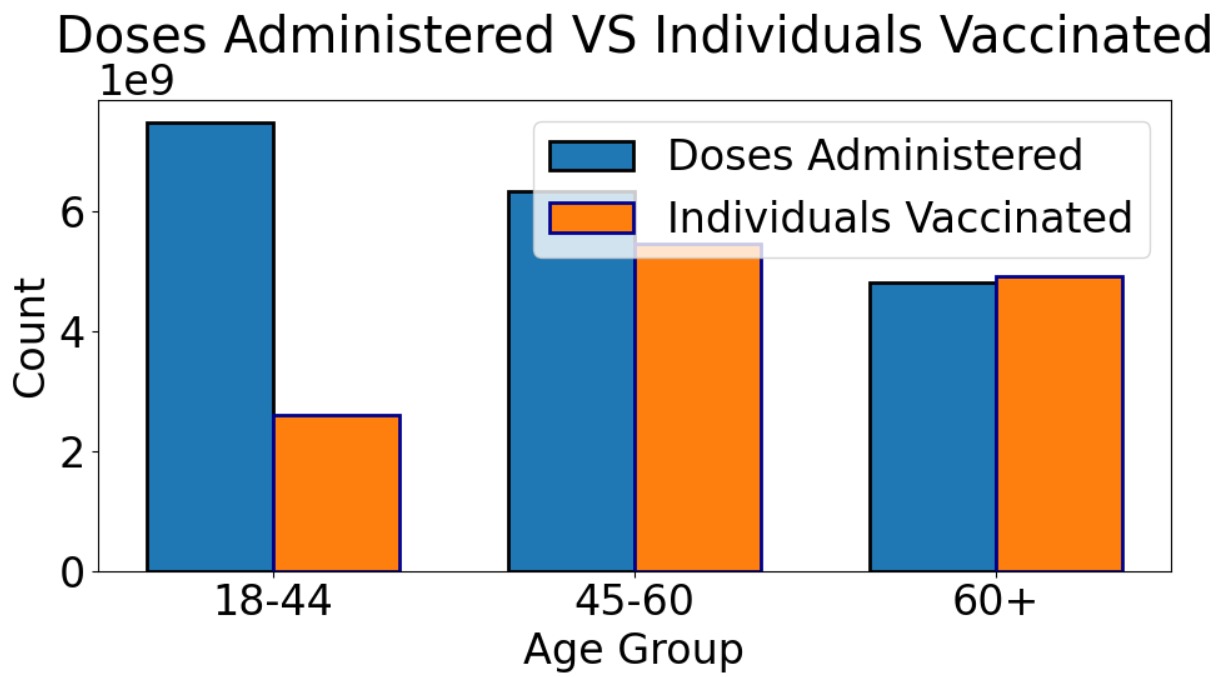 The bar chart compares the number of vaccine doses administered across different age groups. It shows that a higher number of doses were given to the 18-44 age group compared to those vaccinated in the 45-60 and 60+ categories. This indicates a potential trend in vaccination efforts focusing more on younger individuals.