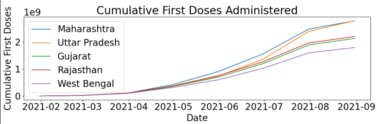 The line chart illustrates the cumulative first doses of vaccination administered across various regions in India, including Maharashtra, Uttar Pradesh, Gujarat, Rajasthan, and West Bengal from February to September 2021. The graph indicates a gradual increase in the number of doses over time. Notably, Maharashtra leads with the highest cumulative first doses in comparison to other states during this period.