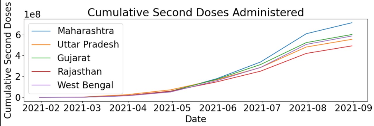 The line chart displays the cumulative second doses of vaccinations administered across various Indian states from February to September 2021. Maharashtra, Uttar Pradesh, Gujarat, Rajasthan, and West Bengal are highlighted, showing the progression of vaccination efforts over time. The data indicates a steady increase in the number of second doses given as time progressed.
