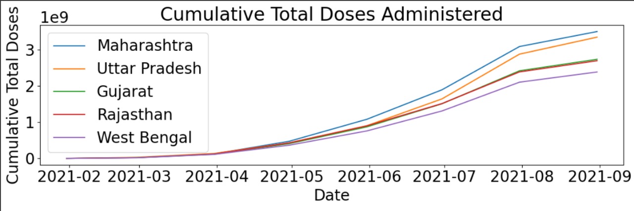 The line chart illustrates the cumulative total doses administered in various Indian states from February to September 2021. Maharashtra, Uttar Pradesh, and Gujarat show notable increases over time. The data highlights the disparities in vaccination progress among the states during this period.