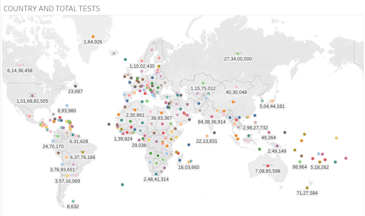 The image is a map displaying countries alongside their total number of tests conducted. The data highlights significant variations in testing across different regions, showcasing some countries with notably high test counts. This information can provide insights into global testing efforts and healthcare responses.