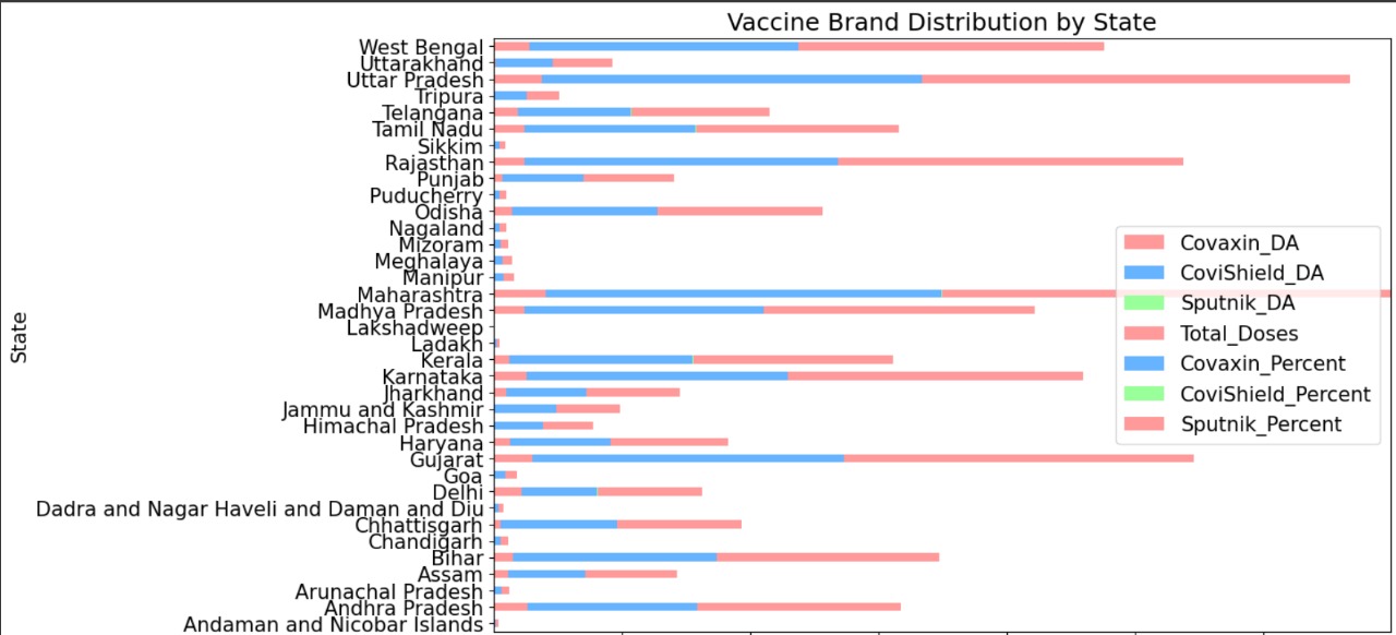The bar chart presents the distribution of COVID-19 vaccine brands by state in India. It compares the number of doses administered for Covaxin (red), Covishield (blue), and Sputnik (green) across different states. The chart also includes total doses and percentage distributions.