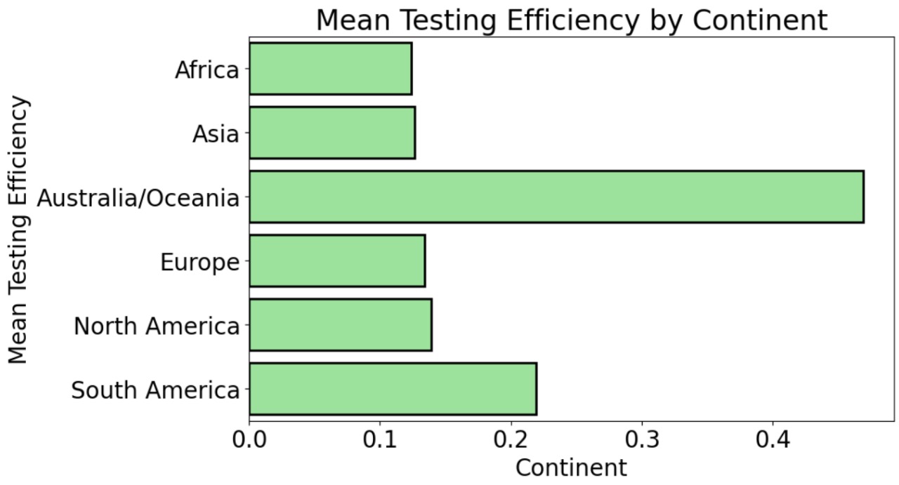 The bar chart displays the mean testing efficiency across different continents, highlighting variations in performance. Africa and South America show lower efficiencies compared to other regions. Europe and North America lead with higher mean testing efficiency levels.