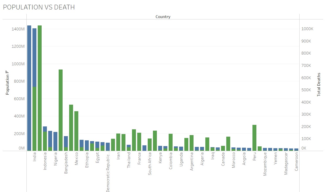 The bar chart compares population size (blue) and total deaths (green) across various countries. India, Indonesia, and Nigeria have the highest populations, while death counts vary significantly among countries. Some nations with smaller populations, like Peru and South Africa, show relatively high death counts, indicating a higher fatality rate compared to their population size.