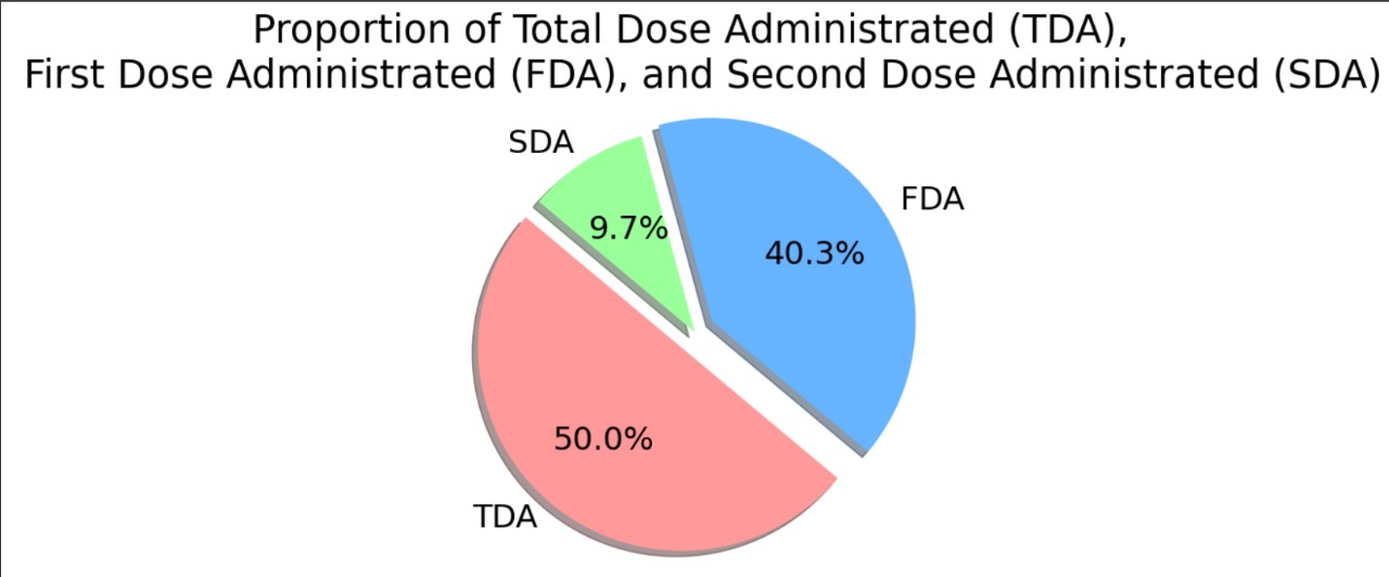 This pie chart displays the proportion of total, first, and second doses administered. 50% of doses were total doses, 40.3% were first doses, and 9.7% were second doses. This data shows the distribution of vaccine administration.