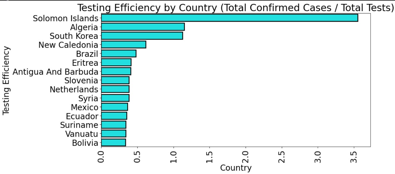 The chart illustrates the testing efficiency by country, measured as the ratio of total confirmed cases to total tests conducted. Notable countries include South Korea with a high efficiency rating, while others like Syria and Brazil show significantly lower ratios. This data highlights variations in testing effectiveness across different nations.