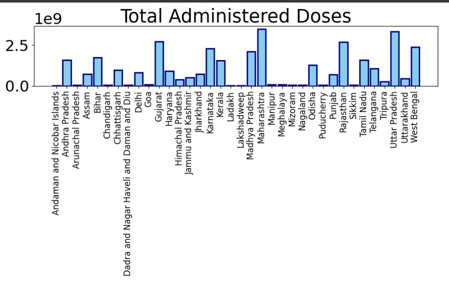 This chart illustrates the total administered doses across various regions in India, with a numerical representation for each state and union territory. It presents a clear comparison of vaccination efforts nationwide. The data ranges from 0.0 to 2.5, indicating varying levels of dosage administered.